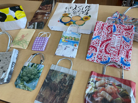 三条市の環境啓発施設「かんきょう庵」にて、環境について考えたり、新聞紙や古紙を再利用してエコバッグ作りをしたりしました。風向きを考えた間取りや太陽光発電等、自然をいかした環境に優しい建物の話を聞くことや、隣接する清掃センターの動画視聴によりゴミの分別やリサイクルについて知ることができ、環境啓発についてよい学びとなりました。また、エコバッグ作りでは、新聞紙で作り方の練習をしてから、それぞれいらなくなった包装紙やカレンダー等、持ち寄った材料を使って、思い思いのエコバッグ作りを楽しみました。