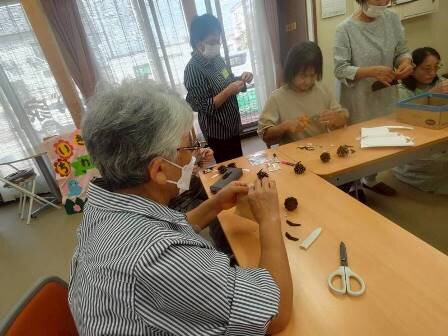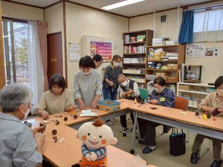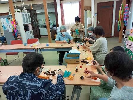 皆さん、出来上がった松ぼっくりフクロウの集合写真を撮り、「かわいいねえ」と満足な様子(*^▽^*)