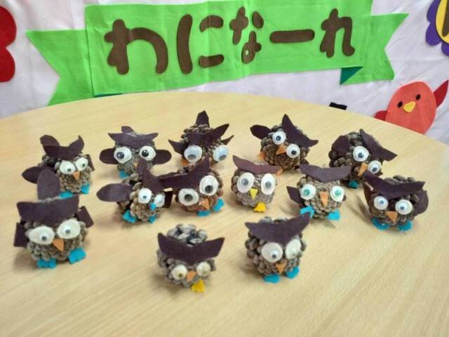 今回は松ぼっくりでフクロウを作りました。松ぼっくりを選び、フクロウの顔など「どうしよう」と楽しくイメージし、ワクワクしながら作られていました。