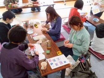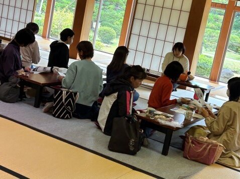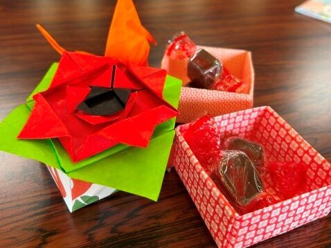 その後は、お茶とケーキをいただきながら、広島に献納された折り鶴を再生して作られた折り紙で、ポチ袋やバラの小箱を作り、てしごとを楽しみました。