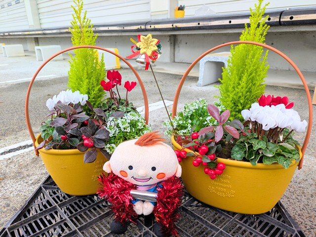 小さな杉の木『コニファーウィルマ』を中心に、紅白の『ガーデンシクラメン』、白い小花がこんもりとした『アリッサム』、赤い実が可愛い『チェッカーベリー』の5種類をバランス良くプランターに配置し、ウォータースペースを意識しながら土入れをしていきました。心配な所や不安な部分は今川さんから丁寧に教えてもらいながら、赤・白・緑が映える、クリスマスからお正月にかけて楽しめる素敵な寄せ植えができました。
