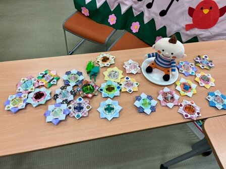 かわいい模様やキラキラした折り紙などを使い、色とりどりのコマがたくさん出来上がりました。