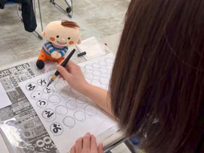 はじめに、筆ペンの扱い方を教えていただき、己書の基本となる筆で丸く描く〈ぐるぐる〉とひらがな50音を描きました。50音は、文字の書き順を逆から描くことで脳を活性化させる役割があり、認知症にもいいとお話しがありました。