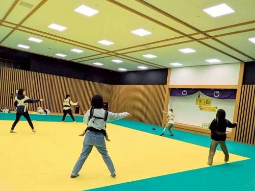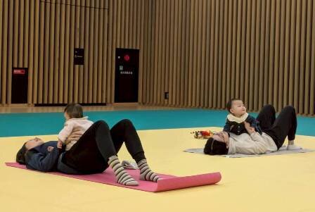 まずは、ウォーミングアップにママたちの身体をストレッチしました。温かい道場のやわらかい畳の上で、ママたちは足を伸ばして身体をほぐしていきました。