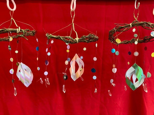 「作業はあまり簡単ではなく少し難しいけれど、作ってみて楽しい」をテーマに、参加の皆さんからイメージを膨らませてもらえるよう、スタッフの試作品を見ていただきながら作業を進めました。モビールの中心のモチーフ作りに苦戦しつつも、みなさんステキなモビールが完成しました。