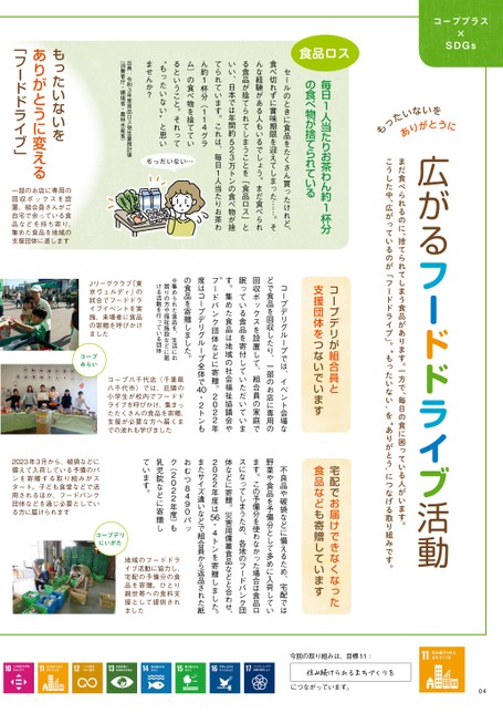 今回の取り組みは、目標11:につながっています。04コーププラス×SDGsないをりがとうにたいあっも広がるフードドライブ活動まだ食べられるのに、捨てられてしまう食品があります。一方で、毎日の食に困っている人がいます。こうした中、広がっているのが「フードドライブ」。“もったいない”を“ありがとう”につなげる取り組みです。食品ロス毎日1人当たりお茶わん約1杯分の食べ物が捨てられているセールのときに食品をたくさん買ったけれど、食べ切れずに賞味期限を迎えてしまった……。そんな経験がある人もいるでしょう。まだ食べられる食品が捨てられてしまうことを「食品ロス」といい、日本では年間約523万トンの食べ物が捨てられています。これは、毎日1人当たりお茶わん約1杯分(114グラム)の食べ物を捨てているということ。それって“もったいない”と思いもったいない…ませんか?コープデリグループでは、イベント会場などで食品を回収したり、一部のお店に専用の回収ボックスを設置して、組合員の家庭で眠っている食品を寄付していただいています。集めた食品は地域の社会福祉協議会やードバンク団体などに寄贈。2022年0・2トンもフ※度はコープデリグループ全体で4の食品を寄贈しました。※集められた食品を、生活にお困りの方や福祉施設などに届ける活動を行っている団体出典:令和3年度食品ロス発生量推計値(消費者庁・環境省・農林水産省)もったいないをありがとうに変える「フードドライブ」一部のお店に専用の回収ボックスを設置、組合員さんがご自宅で余っている食品などを持ち寄り、集めた食品を地域の支援団体に渡しますJリーグクラブ「東京ヴェルディ」の試合でフードドライブイベントを実施、来場者に食品の寄贈を呼びかけましたコープみらいコープデリが組合員と支援団体をつないでいます宅配でお届けできなくなった食品なども寄贈していますコープ八千代店(千葉県八千代市)では、近隣の小学生が校内でフードドライブを呼びかけ、集まったたくさんの食品を寄贈、支援が必要な方へ届くまでの流れも学びました不良品や破袋などに備えるため、宅配では野菜や食品を予備分として多めに入荷しています。この予備分を使わなかった場合は食品ロスになってしまうため、各地のフードバンク団体などに寄贈。災害用備蓄食品などと合わせ、2022年度は56・4トンを寄贈しました。またサイズ違いなどで組合員から返品された紙おむつ8490パック(2022年度)も乳児院などに寄贈しています。地域のフードドライブ活動に協力し、宅配の予備分の食品を寄贈。ひとり親世帯への食料支援として提供されました2023年3月から、破袋などに備えて入荷している予備のパンを寄贈する取り組みがスタート。子ども食堂などで活用されるほか、フードバンク団体などを通じ必要としている方に届けられますコープデリにいがた