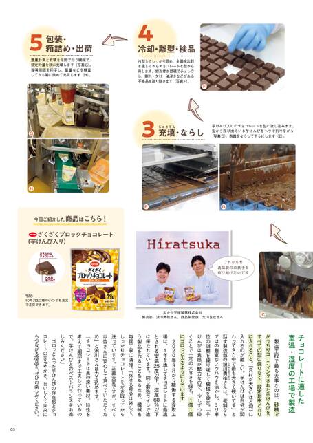 包装・箱詰め・出荷重量計測と充填を自動で行う機械で、規定の量を袋に充填します(写真G)。賞味期限を印字し、重量などを検査してから箱に詰めて出荷します(H)。冷却・離型・検品冷却してしっかり固め、金属検出器を通してからチョコレートを型から外します。担当者が目視でチェックし、割れ・欠け・油浮きなどがある不良品を取り除きます(写真F)。Fじゅうてん填・ならし充芋けんぴ入りのチョコレートを型に流し込みます。型から飛び出ている芋けんぴをヘラで折りながら(写真D)、表面をならして平らにします(E)。GH今回ご紹介した商品はこちら!EDざくざくブロックチョコレート(芋けんぴ入り)チョコレートに適した室温・湿度の工場で製造製造工程で最も大事なのは、砂糖でがっちりコーティングされた芋けんぴを、すべての型に偏りなく、設定比率どおりに入れること。「具材が大きいほど均一に入れるのが難しい。芋けんぴは自分が関わってきた中で最も大きく硬いです」と話す製造部の浪祐さんは、老舗ならではの豊富なノウハウを活かし、ミリ単位の調整を繰り返して機械を設定。「芋けんぴは食感が魅力なので、少しずつ砕くことで一定の大きさを保ち、1個1個にゴロっと入るようにしています」川勇なみかわゆうすけ5度以下、湿度62020年9月から稼働する香取工場は、1年を通してチョコレートに最適0%以下とされる室温2に保たれています。同じ製造ラインで違う製品を作ることもあるため、機械も毎回丁寧に清掃。「外せる部分は外して、しっかりチョコレートをかき取ってから洗っています。正直大変ですが、すべては皆さんに安心して食べていただくため」と浪川さんは力を込めます。「チョコレートは奥の深い素材。特性を考えて細部まで工夫して作っているので、芋けんぴとのベストバランスをお楽しみください」ゴロっと入った芋けんぴの存在感とチョコレートのまろやかさ。おいしくて未来にもつながる商品を、ぜひお楽しみください。03これからも高品質のお菓子を作り続けたいです宅配:10月3回以降のいつでも注文で注文できます。左から平塚製菓株式会社製造部浪川勇祐さん、商品開発課大川友也さんC