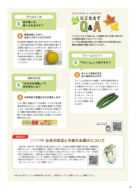 平たねなし柿皮が青いが、食べられますか?果肉は熟しており、お召し上がりいただけます柿は昼夜の寒暖差で皮に色が付きますが、近年のように夜の気温が高すぎる場合、果肉の熟度は進んでも着色が進まないことがあります。産地ではサンプルの試し切りを行い、糖度が高くなったものから収穫、その後渋抜き処理をし、抜き取りで食味を点検してから出荷しています。掃除用洗剤「まぜるな危険」って何が危ないの?化学反応で有毒なガスが発生しますクエン酸など酸性タイプの洗剤と、アルカリ性の塩素系洗剤をまぜると、人体に有毒な塩素ガスが発生します。年末を控え大掃除をする方も多い時期ですが、複数の洗剤は同時に使わないようにしましょう。続けて使う場合も、成分が混ざり危害につながる可能性があります。にこたえてQ&A「こえにこたえてQ&A」は、この時期に多いお問い合わせとその回答を紹介するコーナーです。コープは、組合員の皆さんから寄せられた声を受け止め、商品や運営の改善に役立てています。ブルームきゅうり「ブルーム」って何ですか?きゅうり自体が出す白い粉状のものですブルームは天然のロウ物質で、水分の蒸発を防ぎみずみずしさを保つことができます。ブルームきゅうりは果皮がやわらかく、かつては多く生産されていましたが、異物に見えることから現在はブルームがないきゅうりが主流になりました。ブルームは、ブルーベリーやぶどうなどの表面にも見られます。バックナンバーもご覧いただけます。お知らせコープデリ宅配お米の状況と今後のお届けについて2025年(令和7年)産の新米が出回り始めましたが、今年度も記録的な酷暑や水不足、収穫時期の大雨などにより、お米の収穫量不足・歩留まりの悪化が見込まれています。新米の取引価格が高騰していることから、コープデリ宅配では12月頃までに値上げをさせていただく予定です。なお、引き続きお米は上限数を設け、上限を超えた場合は抽選とさせていただきます。また現在受付を休止している「登録米」は2026年1月~3月に期間限定で新規の登録を受け付ける予定です。チラシやeフレンズでご案内しますので、ぜひご検討ください。詳しくは、ホームページをご確認ください。お気づきの点やコープへの各種お問い合わせは、ご利用のコープデリ宅配センターにご連絡ください。06