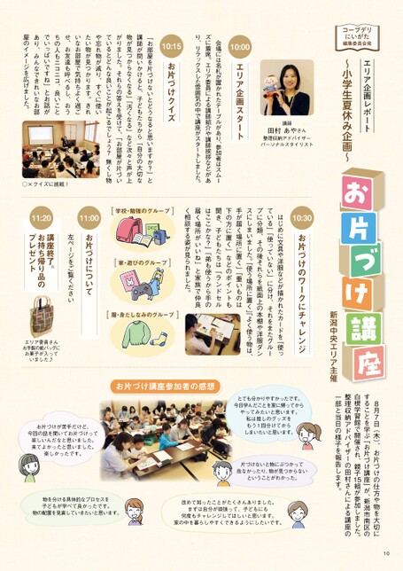 コープデリにいがた編集委員会発エリア企画レポート~小学生夏休み企画~108月7日(木)、お片づけの仕方や物を大切にすることを学ぶ「お片づけ講座」が、新潟市南区の白根学習館で開催され、親子1整理収納アドバイザーの田村さんによる講座の一部と当日の様子を報告します。5組が参加しました。新潟中央エリア主催講師田村あやさん整理収納アドバイザーパーソナルスタイリスト10:00エリア企画スタート会場には名札が置かれたテーブルがあり、参加者はスムーズに着席。エリア委員による講師紹介や講師挨拶などがあり、リラックスした雰囲気の中で講座がスタートしました。10:15お片づけクイズ「お部屋を片づけないとどうなると思いますか?」と講師が問いかけると、子どもたちから「自分の大切な物が見つからなくなる」「汚くなる」など次々と声が上がりました。それらの答えを受けて、「お部屋が片づいているとどんな良いことが起こるでしょう?無くし物や忘れ物が減り、すぐに使いたい物が見つかります。きれいなお部屋で気持ちよく過ごせ、お友達も呼べるし、おうちの人もニコニコ、良いことでいっぱいですね」とお話があり、みんなできれいなお部屋のイメージを広げました。○×クイズに挑戦!10:30お片づけのワークにチャレンジはじめに文具や洋服などが描かれたカードを「使っている」「使っていない」に分け、それをまたグループに分類、その後それらを紙面上の本棚や洋服ダンスにしまいました。「使う場所に置く」よく使う物は、手が届く場所に置く」「重いものは下の方に置く」などのポイントも聞き、子どもたちは「ランドセルはここかな?」「弟も使うから手の届く場所がいいね」と家族で仲良く相談する姿が見られました。学校・勉強のグループ家・遊びのグループ服・身だしなみのグループ11:2011:00お片づけについて左ページをご覧ください講座終了。お持ち帰り品のプレゼントエリア委員さんお手製の紙バッグにお菓子が入っていました♪お片づけ講座参加者の感想お片づけが苦手だけど、今回の話を聞いてお片づけって楽しいんだなと思いました。来てよかったと思いました。楽しかったです。とても分かりやすかったです。今日学んだことを家に帰ってからやってみたいと思います。私は推しのグッズをもう1回分けてからしまいたいと思います。片づけないと物にぶつかって危なかったり、物が見つからないということがわかった。物を分ける具体的なプロセスを子どもが学べて良かったです。物の配置を見直していきたいと思います。改めて知ったことがたくさんありました。まずは自分が頑張って、子どもにも何度もチャレンジしてほしいと思います。家の中を暮らしやすくできるようにしたいです。
