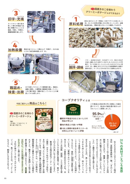 印字・充じゅうてん填タンクから一部を抜き取って理化学検査で品質に問題がないことを確認。充填し(写真E)、重量検査機を通します。E国産きのこを味わうクリーミーポタージュができるまで原料処理前日に生のエリンギ(写真A)をゆでてサイコロ状にカット(B)。まいたけ水煮も同様に大きさ別にカットします。金属検出器を通し、異物の混入がないことを確認しておきます。加熱殺菌商品を並べたトレーを積み上げ(写真F)、大きな釜に入れて加圧加熱殺菌します(G)。BAGFかくはん拌・調味攪バター、あめ色たまねぎ、たまねぎペースト、刻みたまねぎを投入、加熱しながら混ぜていきます。まいたけとエリンギ(写真C)、サイコロ状にカットしたじゃがいもを入れてさらに混ぜます(D)。最後にきのこエキスなどの液体調味料と焙焼小麦粉を投入。スープにとろみが出てきたら加熱を止めます。箱詰め・検査・出荷水で冷却してからエックス線検査を通し、箱詰め。倉庫に保管し、2週間後に菌検査を実施、パッケージ内で菌の発生・増殖が起こっていないことを確認してから出荷します。DC今回ご紹介した商品はこちら!コープクオリティとはこの商品は2024年2月に実施した組合員テストで、95.9%の組合員の皆さんが「おいしい」と回答しました。国産きのこを味わうクリーミーポタージュ宅配:1月1回に『ぐるめぐり』で取り扱う予定です。❶原料や製造方法などおいしさの理由が明らか❷他の商品との違いが明確❸100人規模の組合員モニターの8割以上がおいしいと評価95.9%が「おいしい」と回答!おいしい77.3%ややおいしい18.6%人数=9731%の具材でごろごろ食感仕入れるきのこはすべてホクト株式会社(長野県長野市)製。「きのこエキスはホクト社と理研ビタミンが共同開発したもので、廃棄していたぶなしめじの軸や石づきを活用したもの。このエキスのうまみをベースに仕上げました」と藤井さんは胸を張ります。たまねぎはあめ色になるまで炒めて甘みを出したもの、蒸してすりつぶしうまみを出したもの、刻んでシャキシャキ食感を出したものと3種をブレンドするこだわりよう。とろみ加減にもこだわり、原料に焙ばいしょう焼小麦粉を使っています。「家庭でホワイトソースを作るとき、小麦粉を炒めますよね。あらかじめ加熱(焙焼)した小麦粉を使うことでその風味を再現でき、香ばしく口どけの良い仕上がりになります」製造する株式会社アーデン(長野県川一則さんは、「この商品は、小諸市)はホクト社のグループ会社で、きのこを使ったレトルト商品を多く手掛けています。同商品に携わる美みさいづてつや齊津哲也さんと市いちかわかずのり開発段階から藤井さんにいろいろ相談されました。藤井さんが意図した味や食感を間違いなく実現できるよう、具材量1%に。これは充じゅうてん填できるギリギリは3なんです」と振り返ります。3社が協力して作り上げたポタージュは、食べごたえ十分。ディナーはもちろん、朝食にもおすすめです。03