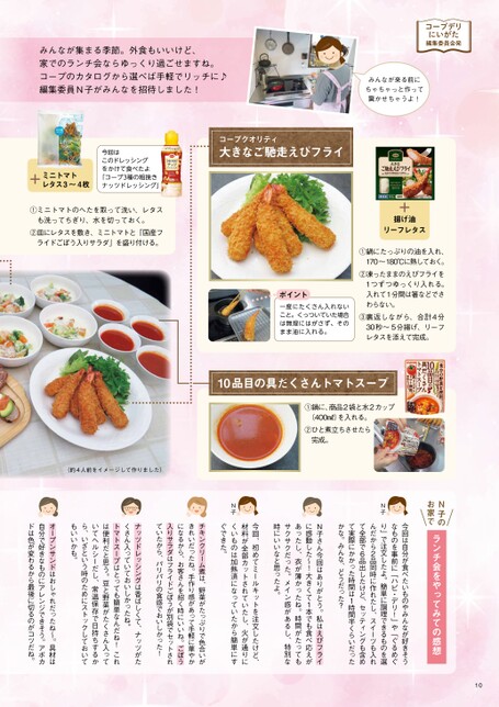 みんなが集まる季節。外食もいいけど、家でのランチ会ならゆっくり過ごせますね。コープのカタログから選べば手軽でリッチに♪編集委員N子がみんなを招待しました!コープデリにいがた編集委員会発みんなが来る前にちゃちゃっと作って驚かせちゃうよ!今回はこのドレッシングをかけて食べたよ「コープ3種の粗挽きナッツドレッシング」ミニトマトレタス3~4枚①ミニトマトのへたを取って洗い、レタスも洗ってちぎり、水を切っておく。②皿にレタスを敷き、ミニトマトと「国産フライドごぼう入りサラダ」を盛り付ける。コープクオリティ大きなご馳走えびフライ揚げ油リーフレタス①鍋にたっぷりの油を入れ、170~180℃に熱しておく。②凍ったままのえびフライを1つずつゆっくり入れる。入れて1分間は箸などでさわらない。③裏返しながら、合計4分30秒~5分揚げ、リーフレタスを添えて完成。ポイント一度にたくさん入れないこと。くっついていた場合は無理にはがさず、そのまま油に入れる。10品目の具だくさんトマトスープ①鍋に、商品2袋と水2カップ(400㎖)を入れる。②ひと煮立ちさせたら完成。10N子のお家でランチ会をやってみての感想N子今回は自分が食べたいものやみんなが好きそうなものを事前に「ハピ・デリ!」や「ぐるめぐり」で注文したよ。簡単に調理できるものを選んだから2品同時に作れたし、スイーツも入れて全部で6品出したけど、セッティングも含めて実際にかかった時間は1時間半くらいだったかな。みんな、どうだった?N子さん今回はありがとう。私はえびフライに感動した~!大きくて1本でも食べ応えがあったし、衣が薄かったね。時間がたってもサクサクだった。メイン感があるし、特別な時にいいなと思ったよ。今回、初めてミールキットを注文したけど、材料が全部カットされていたし、火が通りにくいものは加熱済になっていたから簡単にすぐできた。N子チキンクリーム煮は、野菜がたっぷりで色合いがきれいだったね。手作り感があって手軽に華やかになるから、お客さんを招く時にいいね。ごぼう入りサラダはフライドごぼうが別袋でセットされていたから、パリパリの食感でおいしかった!ナッツドレッシングは香ばしくて、ナッツがたくさん入っていておいしかったね。トマトスープはとっても簡単なんだね!これは便利だと思う。豆と野菜がたくさん入っていてヘルシーだし、常温保存で日持ちするから、いざという時のためにストックしておいてもいいかも。オープンサンドはおしゃれだったね~。具材は自分で好きなものにアレンジできそう。アボカドは色が変わるから最後に切るのがコツだね。(約4人前をイメージして作りました)