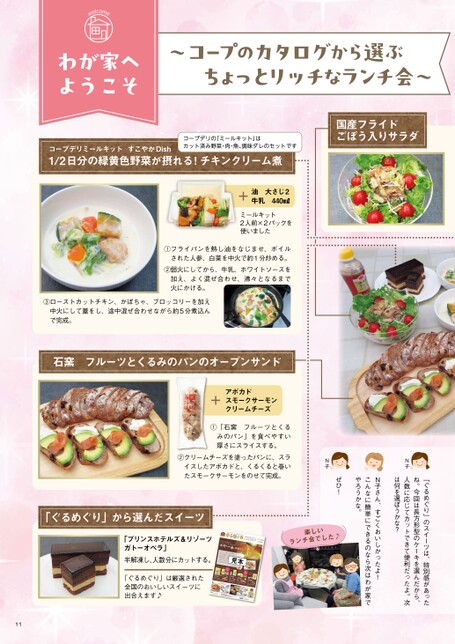 コープデリの「ミールキット」はカット済み野菜・肉・魚、調味ダレのセットです国産フライドごぼう入りサラダコープデリミールキットすこやかDish1/2日分の緑黄色野菜が摂れる!チキンクリーム煮「ぐるめぐり」のスイーツは、特別感があったね。今回は長方形型のケーキを選んだから、人数に応じてカットできて便利だったよ。次は何を選ぼうかな?N子N子さん、すごくおいしかったよ!こんなに簡単にできるのなら次はわが家でやろうかな。ぜひ!N子アボカドスモークサーモンクリームチーズ①「石窯フルーツとくるみのパン」を食べやすい厚さにスライスする。②クリームチーズを塗ったパンに、スライスしたアボカドと、くるくると巻いたスモークサーモンをのせて完成。「ぐるめぐり」から選んだスイーツ「プリンスホテルズ&リゾーツガトーオペラ」半解凍し、人数分にカットする。見本「ぐるめぐり」は厳選された全国のおいしいスイーツに出合えます♪楽しいランチ会でした♪11油大さじ2牛乳440㎖ミールキット2人前×2パックを使いました①フライパンを熱し油をなじませ、ボイルされた人参、白菜を中火で約1分炒める。②弱火にしてから、牛乳、ホワイトソースを加え、よく混ぜ合わせ、沸々となるまで火にかける。③ローストカットチキン、かぼちゃ、ブロッコリーを加え中火にして蓋をし、途中混ぜ合わせながら約5分煮込んで完成。石窯フルーツとくるみのパンのオープンサンド